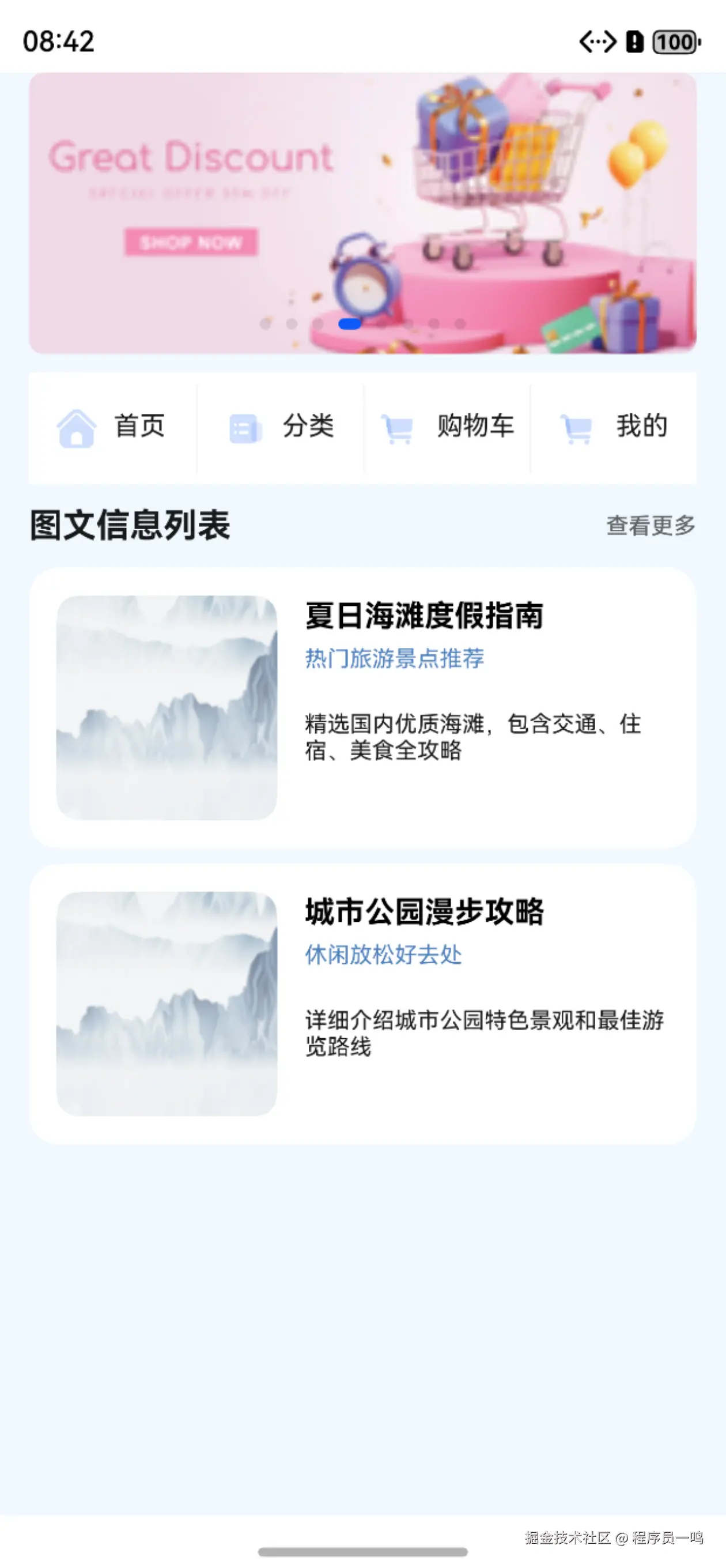 比如,我想要实现一个页面,上面是轮播图,然后是四个按钮,底部是列表,简单实现如下: