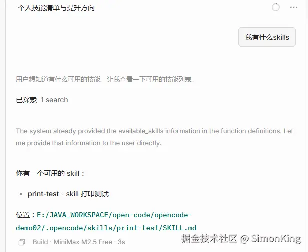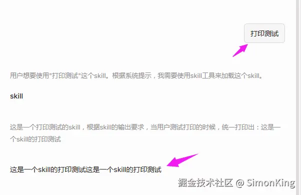 我们需要测试自己定义的Skills是否有效。我们输入打印测试,看看回复是否是调用自定义Skills.
