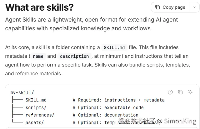 Skills是智能体的技能,是一种轻量级、开放的格式,用于通过专业知识和工作流程扩展人工智能智能体的能力。而其本质上就是教 AI 按固定流程做事的操作说明书,一旦写好,就能像函数一样反复调用。