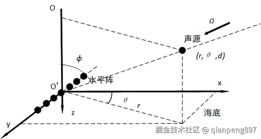 <math xmlns="http://www.w3.org/1998/Math/MathML" display="block"> X ( ω ) ⏟ 接收信号 = p s ( ω ) S ( ω ) ⏟ 声场信号 + N ( ω ) ⏟ 阵噪声 = [ p 1 ( ω ) ⋮ p M ( ω ) ] ⏟ 声场向量 S ( ω ) ⏟ 源信号 + [ n 1 ( ω ) ⋮ n M ( ω ) ] ⏟ 噪声向量 \underbrace{\boldsymbol{X}(\omega)}{\text{接收信号}} = \underbrace{\boldsymbol{p}s(\omega)S(\omega)}{\text{声场信号}} + \underbrace{\boldsymbol{N}(\omega)}{\text{阵噪声}} = \underbrace{\begin{bmatrix}p_1(\omega)\\\vdots\\p_M(\omega)\end{bmatrix}}{\text{声场向量}} \underbrace{S(\omega)}{\text{源信号}} + \underbrace{\begin{bmatrix}n_1(\omega)\\\vdots\\n_M(\omega)\end{bmatrix}}_{\text{噪声向量}} </math>接收信号 X(ω)=声场信号 ps(ω)S(ω)+阵噪声 N(ω)=声场向量 p1(ω)⋮pM(ω) 源信号 S(ω)+噪声向量 n1(ω)⋮nM(ω)