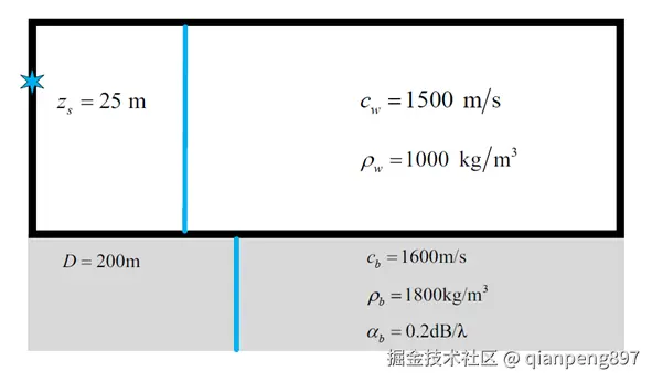 在典型的Pekeris浅海环境下进行匹配场定位,Pekeris 波导为典型的浅海波导环境,其海洋环境参数下图所示。海洋声场模型分为真空层上半空间、海水层和海底层下半空间,其中海水层为声速 <math xmlns="http://www.w3.org/1998/Math/MathML"> c w = 1500 m/s c_w = 1500\ \text{m/s} </math>cw=1500 m/s 、密度 <math xmlns="http://www.w3.org/1998/Math/MathML"> ρ w = 1000 kg/m 3 \rho_w = 1000\ \text{kg/m}^3 </math>ρw=1000 kg/m3 、海深 <math xmlns="http://www.w3.org/1998/Math/MathML"> D = 200 m D = 200\ \text{m} </math>D=200 m 的均匀介质;海底声速 <math xmlns="http://www.w3.org/1998/Math/MathML"> c b = 1600 m/s c_b = 1600\ \text{m/s} </math>cb=1600 m/s ,海底密度 <math xmlns="http://www.w3.org/1998/Math/MathML"> ρ b = 1800 kg/m 3 \rho_b = 1800\ \text{kg/m}^3 </math>ρb=1800 kg/m3 ,海底衰减 <math xmlns="http://www.w3.org/1998/Math/MathML"> α b = 0.2 dB/ λ \alpha_b = 0.2\ \text{dB/}\lambda </math>αb=0.2 dB/λ 。声源深度 <math xmlns="http://www.w3.org/1998/Math/MathML"> z s = 25 m z_s = 25\ \text{m} </math>zs=25 m ,接收器深度 <math xmlns="http://www.w3.org/1998/Math/MathML"> z r = 1 ∼ 91 m z_r = 1 \sim 91\ \text{m} </math>zr=1∼91 m ,间隔5m,阵元个数为19个,接收器距离 <math xmlns="http://www.w3.org/1998/Math/MathML"> r r = 2 km r_r = 2\ \text{km} </math>rr=2 km 。