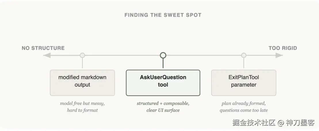 最初,团队尝试在 ExitPlanTool 中添加一个参数,让模型在产出计划的同时给出需要用户澄清的问题。这看似方便,却让 Claude 陷入困惑:为什么要同时输出一个 plan 和关于这个 plan 的疑问?如果用户的回答与原有 plan 冲突该怎么办?是否需要调用两次 EditPlanTool?