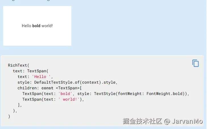 Flutter 提供了 RichText 组件,专门用于展示具有多种样式的复合文本。此外,还有一个 Text.rich 构造函数,它们在功能上殊途同归,但在细节处理上略有不同。