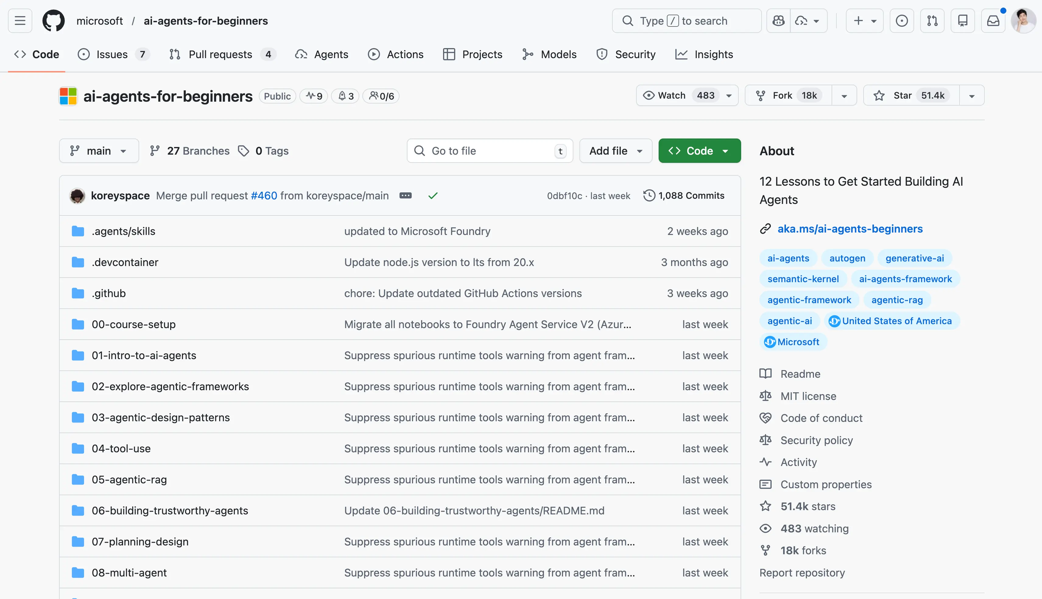 大家好,我是程序员鱼皮。最近又挖到一个好东西,微软在 GitHub 上开源了一套 AI Agent 零基础课程,叫《AI Agents for Beginners》,目前 Star 已经突破 5 万了。