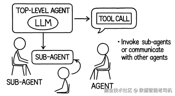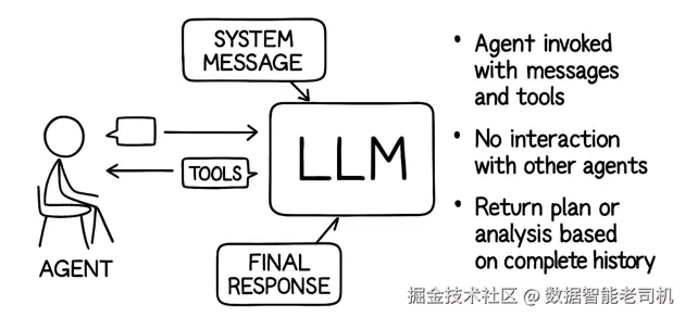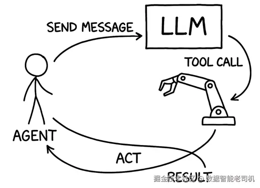 如果收到的消息是最终回复,那么智能体处理结束,循环终止,并把回复返回给调用方(用户、其他系统或更高层智能体)。但如果收到的消息是 LLM 指示智能体执行某个动作(通常是一次工具调用),那么智能体会执行该动作,然后把动作结果再发回给 LLM,继续循环。