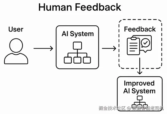 人类反馈在塑造智能体 AI 系统的行为与质量方面起着关键作用。不同于依赖预定义规则或指标的自动化评估,人类反馈能够捕捉诸如"有用性、语气、清晰度、用户满意度"等主观要素。这在创意写作、决策制定或用户协助等开放式任务中尤其有价值------因为在这些场景里,刚性的评估标准往往不够用。用户可以通过对回复打分、标记错误动作或选择更偏好的输出等方式提供直接反馈;也可以从用户行为中收集隐式反馈,例如用户是否继续与智能体互动,或是否提前放弃任务。