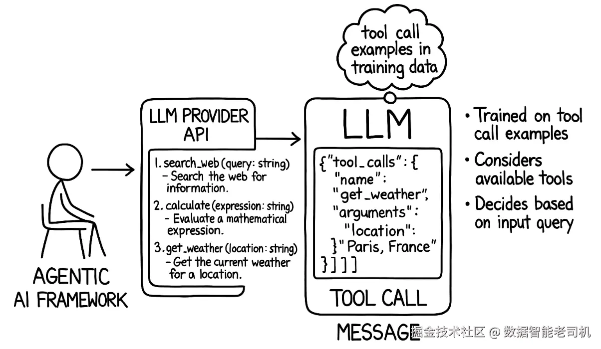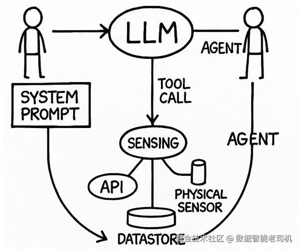 用户、AI 框架或其他智能体可能以系统提示词、初始用户消息(用户不一定是人类)以及一组工具来调用智能体。然而,这些初始信息总是先被发送给 LLM;LLM 可能会决定通过发送工具调用消息来触发感知。随后智能体执行工具调用------可能是从 API 或物理传感器读取数据,也可能是利用 RAG------并把收集到的数据返回给 LLM。