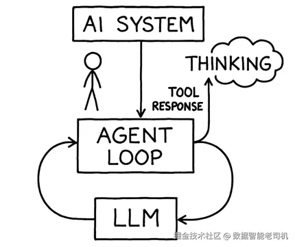 这里有个"反直觉"的点------思考阶段并不是智能体循环中的一个独立阶段。所有思考都由 LLM 完成:无论是规划、推理、分析之前工具调用的结果、决定调用哪些工具,当然也包括组织最终回复。智能体循环只是与 LLM 交换消息的通道。每当智能体循环向 LLM 发送消息时,思考就发生一次。