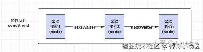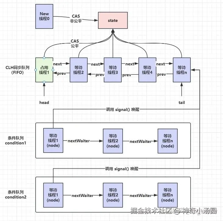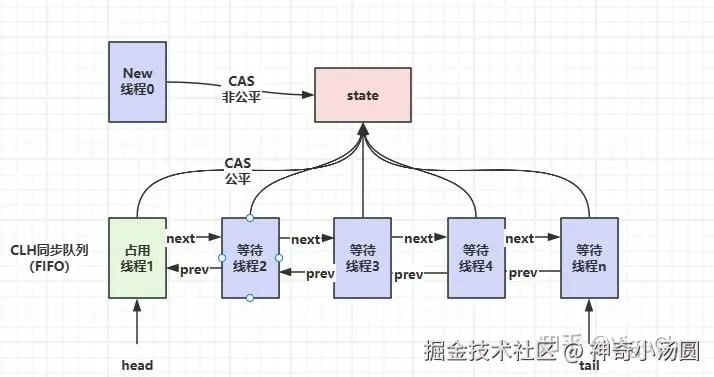 * **其二是基于抽象队列同步器(AQS)构建的`java.util.concurrent.locks.Lock`显式锁机制。** *** ** * ** *** ## 一、**AQS原理分析** ### **1、什么是AQS** java.util.concurrent 包中的同步器大多构建在一些共同的基础行为之上,例如等待队列、条件队列、独占获取与共享获取等。这些行为被抽象为一个统一的框架------**AbstractQueuedSynchronizer(简称 AQS)** 。 AQS 是一个用于实现依赖状态型同步器的抽象同步框架,为构建各种同步机制提供了基础支持。 ### 2、AQS实现方式 * 一般是通过一个内部类Sync继承 AQS * 将同步器所有调用都映射到Sync对应的方法 **2.1、举个例子** 🌰🌰 **(ReentrantLock)** ```scala public class ReentrantLock implements Lock, java.io.Serializable { private static final long serialVersionUID = 7373984872572414699L; ...... private final Sync sync; abstract static class Sync extends AbstractQueuedSynchronizer {} ...... } ``` ### **3、AQS具备的特性** * 阻塞等待队列 * 共享/独占 * 公平/非公平 * 可重入 * 允许中断 *** ** * ** *** ## 二、**AQS核心结构** ### **1、** AQS核心**源码** ```csharp public abstract class AbstractQueuedSynchronizer extends AbstractOwnableSynchronizer implements java.io.Serializable { static { try { stateOffset = unsafe.objectFieldOffset (AbstractQueuedSynchronizer.class.getDeclaredField("state")); headOffset = unsafe.objectFieldOffset (AbstractQueuedSynchronizer.class.getDeclaredField("head")); tailOffset = unsafe.objectFieldOffset (AbstractQueuedSynchronizer.class.getDeclaredField("tail")); waitStatusOffset = unsafe.objectFieldOffset (Node.class.getDeclaredField("waitStatus")); nextOffset = unsafe.objectFieldOffset (Node.class.getDeclaredField("next")); } catch (Exception ex) { throw new Error(ex); } } ..... //链表头节点 private transient volatile Node head; // 链表尾节点 private transient volatile Node tail; //共享变量,使用volatile修饰保证线程可见性 private volatile int state; //获取状态 protected final int getState() { return state; } //设置状态 protected final void setState(int newState) { state = newState; } //CAS操作:将同步状态值设置为给定值update如果当前同步状态的值等于expect(期望值) //stateOffset:就是定义的state值 protected final boolean compareAndSetState(int expect, int update) { // See below for intrinsics setup to support this return unsafe.compareAndSwapInt(this, stateOffset, expect, update); } ..... } ``` > ⚠️AQS 的关键实现基于以下两点核心机制: > > ✔️ **关键字段的可见性** > > 在 AQS 源码中,用于表示同步状态的 `state`、以及等待队列的头尾指针 `head` 和 `tail` 均被声明为 `volatile`,确保这些状态在多线程之间的立即可见性。 > > ✔️ **基于 CAS 的无锁竞争设计** > > 获取锁的核心逻辑依赖于对 `state` 字段的 **CAS(Compare-And-Swap)操作**,通过这一原子性操作实现无锁化的线程竞争与状态更新,从而避免传统锁机制带来的阻塞开销。 ### 2、**AQS两种队列** **两种队列结构示意图**  **2.1、同步等待队列** 负责管理在竞争锁失败时进入等待状态的线程,基于双向链表数据结构的队列,是FIFO先进先出线程等待队列,Java中的[CLH队列](https://link.juejin.cn?target=https%3A%2F%2Fzhida.zhihu.com%2Fsearch%3Fcontent_id%3D270246982%26content_type%3DArticle%26match_order%3D1%26q%3DCLH%25E9%2598%259F%25E5%2588%2597%26zhida_source%3Dentity "https://zhida.zhihu.com/search?content_id=270246982&content_type=Article&match_order=1&q=CLH%E9%98%9F%E5%88%97&zhida_source=entity")是原CLH队列的一个变种,**线程由原自旋机制改为阻塞机制**。  **2.1.1、公平锁** 新线程到来时,会先检查同步队列中是否有已在等待的线程。**只要有排队者**,它就会直接进入队列尾部等待,不会尝试获取锁。这是其"公平"的核心。如果队列为空,它仍会尝试获取锁。 **2.1.2、非公平锁** 新线程到来时,无论队列是否为空,都会**先尝试一次CAS操作去"插队"抢锁**。只有抢锁失败后,才会进入队列尾部排队。 > ⚠️提示 > ***✔️AQS默认采用非公平策略,给予了新线程一次"插队"的机会,旨在减少线程切换频率、提升整体吞吐性能。*** > ***✔️线程进入同步队列后,会因无法立即获取锁而发生实际的挂起与唤醒,这一过程涉及内核态切换与上下文恢复,因而存在一定的性能开销*** **2.2、条件等待队列** 与特定条件关联,当线程调用 `await()` 时,**会释放已持有的锁并进入条件队列等待**; 当其他线程调用 `signal()` 唤醒时,**该队列中的线程结点会被移至同步等待队列,重新参与锁的竞争**。  **2.2.1、** 条件**队列源码** 条件队列唤醒 ```java public class ConditionObject implements Condition, java.io.Serializable { private static final long serialVersionUID = 1173984872572414699L; /** First node of condition queue. */ private transient Node firstWaiter; /** Last node of condition queue. */ private transient Node lastWaiter; ...... public final void signal() { if (!isHeldExclusively()) throw new IllegalMonitorStateException(); Node first = firstWaiter; if (first != null) doSignal(first); } // 唤醒 private void doSignal(Node first) { do { if ( (firstWaiter = first.nextWaiter) == null) lastWaiter = null; first.nextWaiter = null; } while (!transferForSignal(first) && (first = firstWaiter) != null); } /** * 将节点从条件队列转移到同步队列 */ final boolean transferForSignal(Node node) { if (!compareAndSetWaitStatus(node, Node.CONDITION, 0)) return false; Node p = enq(node); int ws = p.waitStatus; if (ws > 0 || !compareAndSetWaitStatus(p, ws, Node.SIGNAL)) LockSupport.unpark(node.thread); return true; } } ``` 条件队列转换为同步队列 ```ini private Node enq(final Node node) { for (;;) { Node t = tail; if (t ==