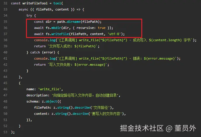 写一个writeFileTool工具方法,让大模型生成代码后调用这个tool,创建文件并且写入代码
