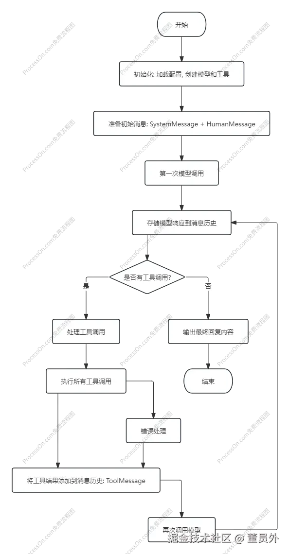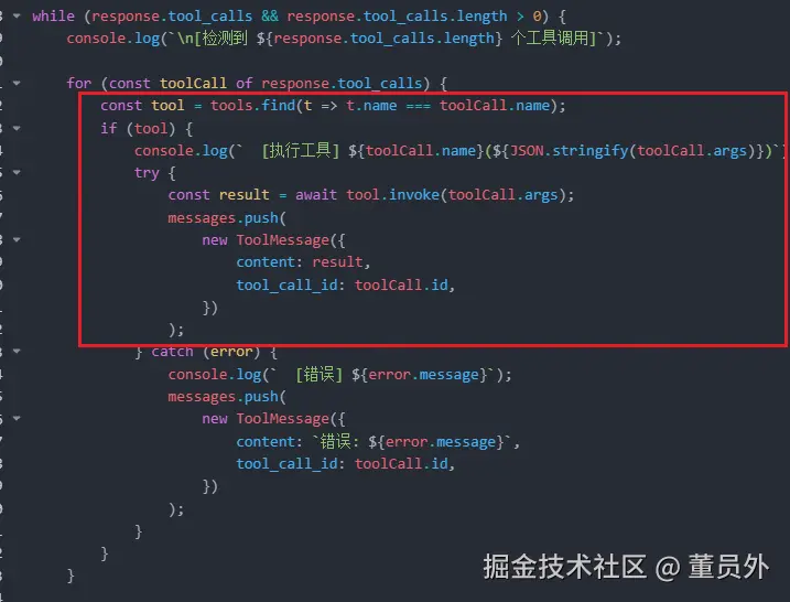 此时我们把AI返回的消息放到messages对话记录里,然后 从tools 数组里找到对应的工具,取出来进行 invoke,并且传入大模型解析出的参数,最后把工具调用结果作为 ToolMessage 传给大模型,让它继续回答
