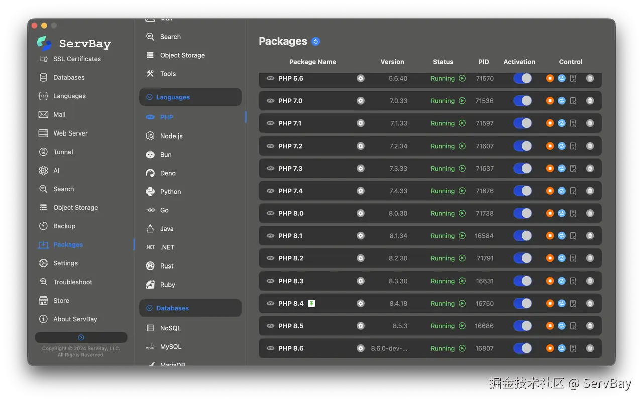 用 ServBay 就能够一键部署完整的 PHP 环境,并且多个 PHP 版本同时运行。这让开发者可以在不干扰现有项目的前提下,快速上线最新的环境来实践这些现代化的架构思维。