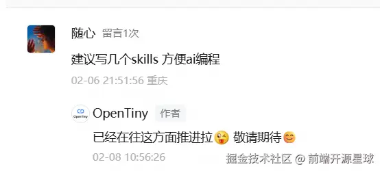 一个月前,有用户建议 TinyVue 出几个 Skills,方便 AI 编程。