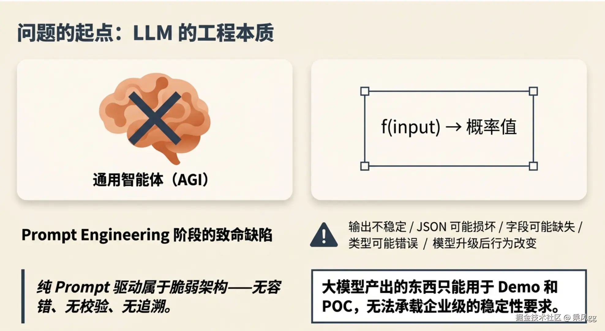 这种纯 Prompt 驱动的调用方式,在生产环境中属于典型的"脆弱架构 "------无容错、无校验、无追溯,完全无法承载企业级场景的稳定性要求。