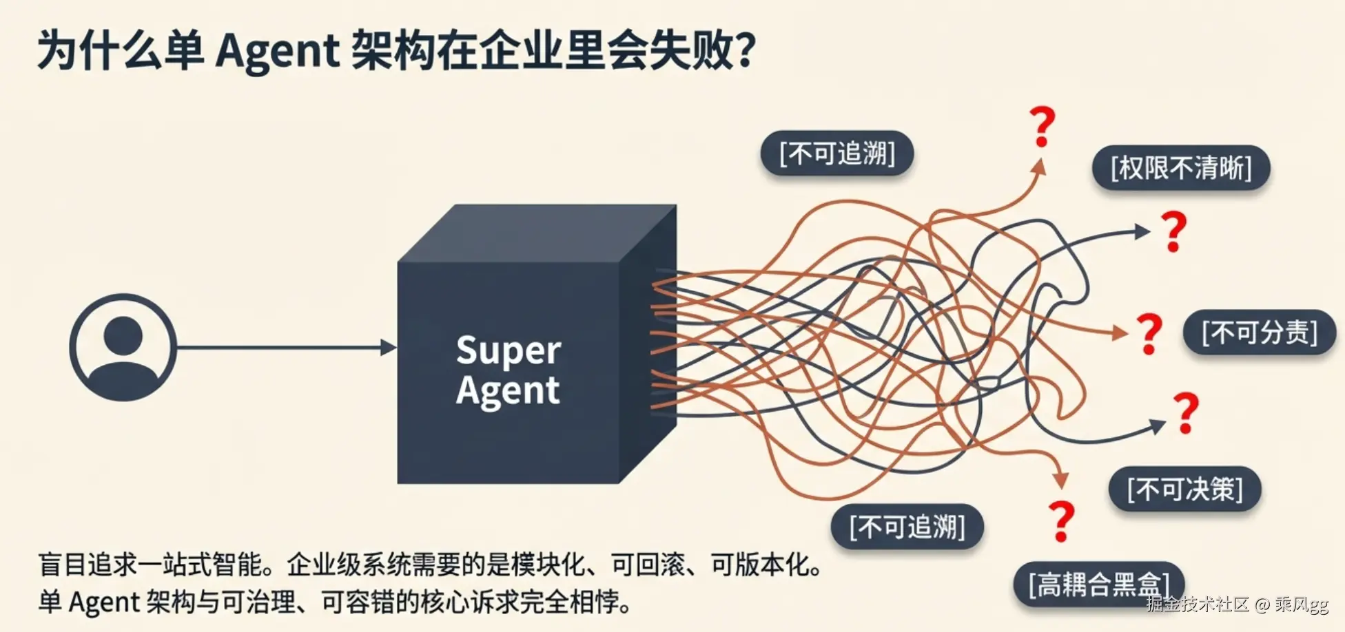 这种"大而全"的单 Agent 架构,与企业级系统"可治理、可追溯、可容错"的核心诉求完全相悖,在实际落地中必然走向失控。