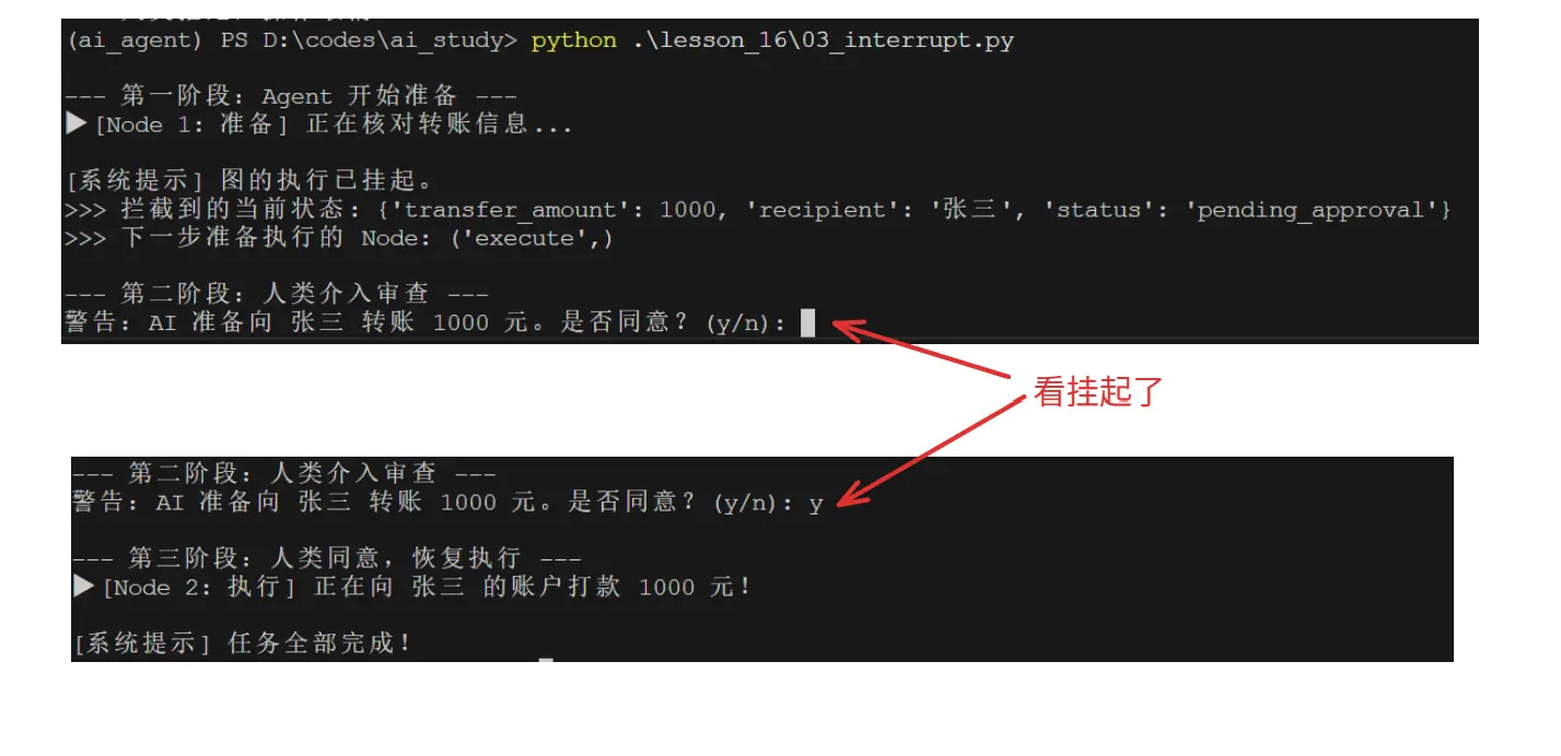 有了 Checkpointer的加持,我们就可以给Agent装上 "中断器(Interrupt)" 了。