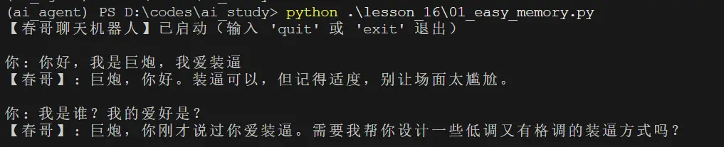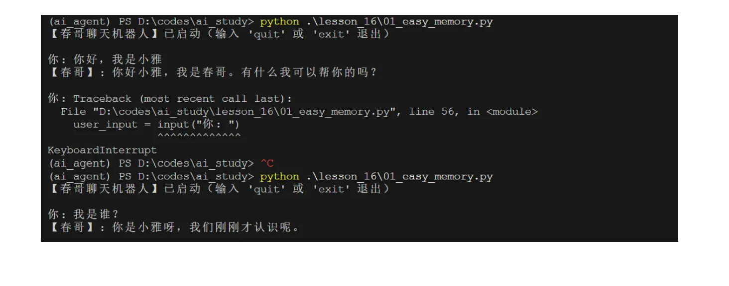 这样,只要程序稳定运行,内存里就可以记住你刚才说的内容。
