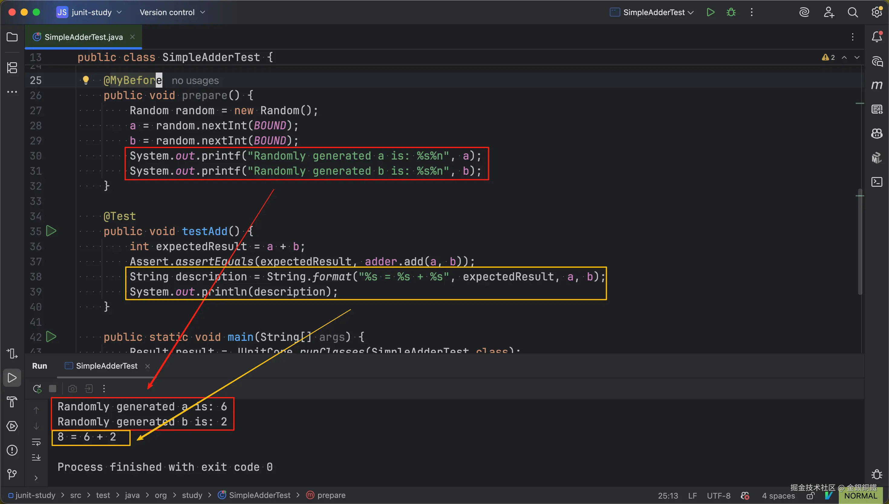其中 红色框 的内容和 prepare() 方法有关,黄色框 的内容和 testAdd() 方法有关。由于 a/b 这两个数字是随机生成的,所以你自己运行时,看到的 a/b 可能是其他值。