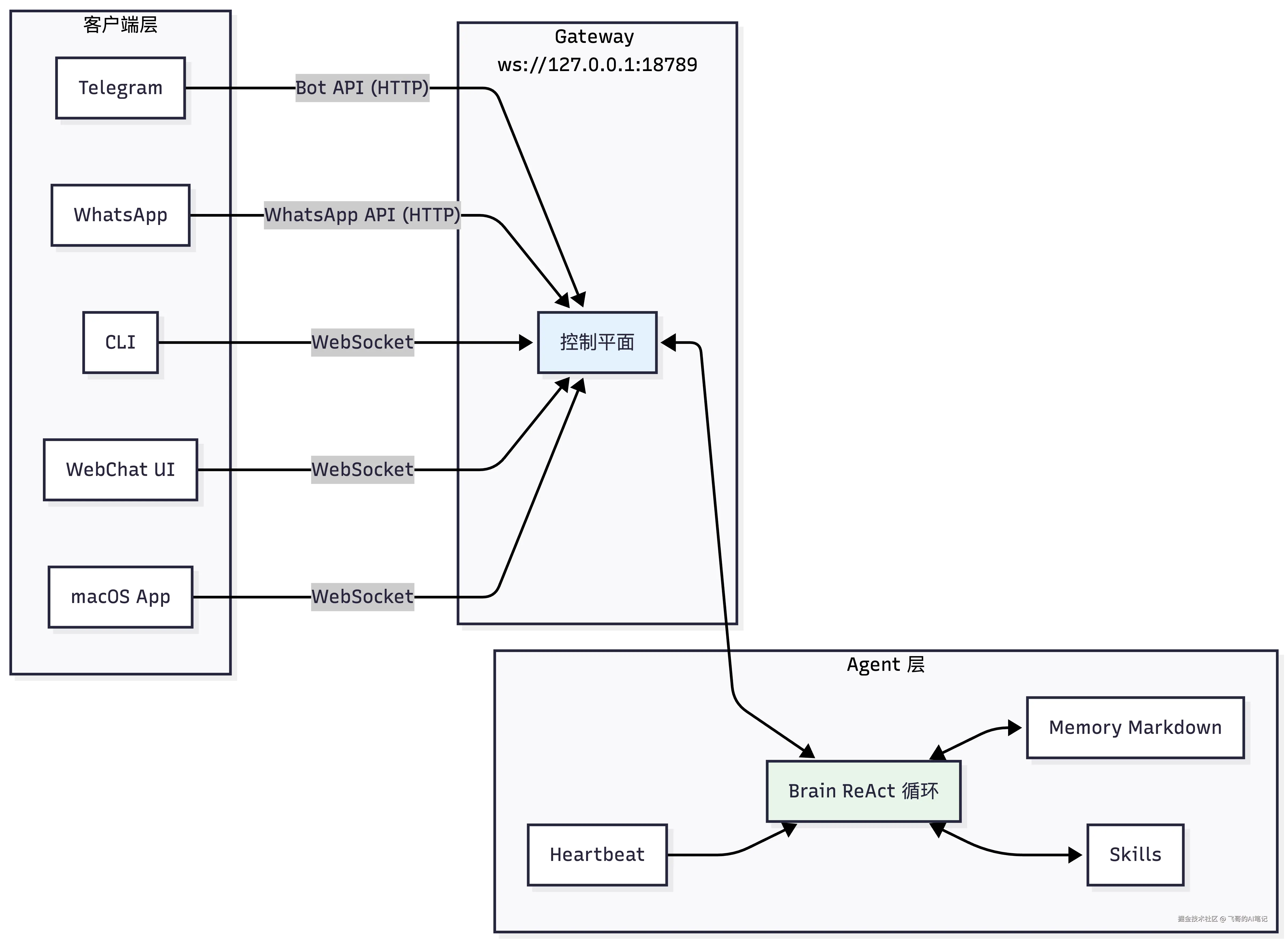 注意图里有个细节:Telegram 和 WhatsApp 走的是 HTTP,CLI/WebChat/App 走的是 WebSocket。这不是矛盾,而是各归其位------外部平台的协议由平台决定,OpenClaw 自己控制的通道全部选择了 WebSocket。