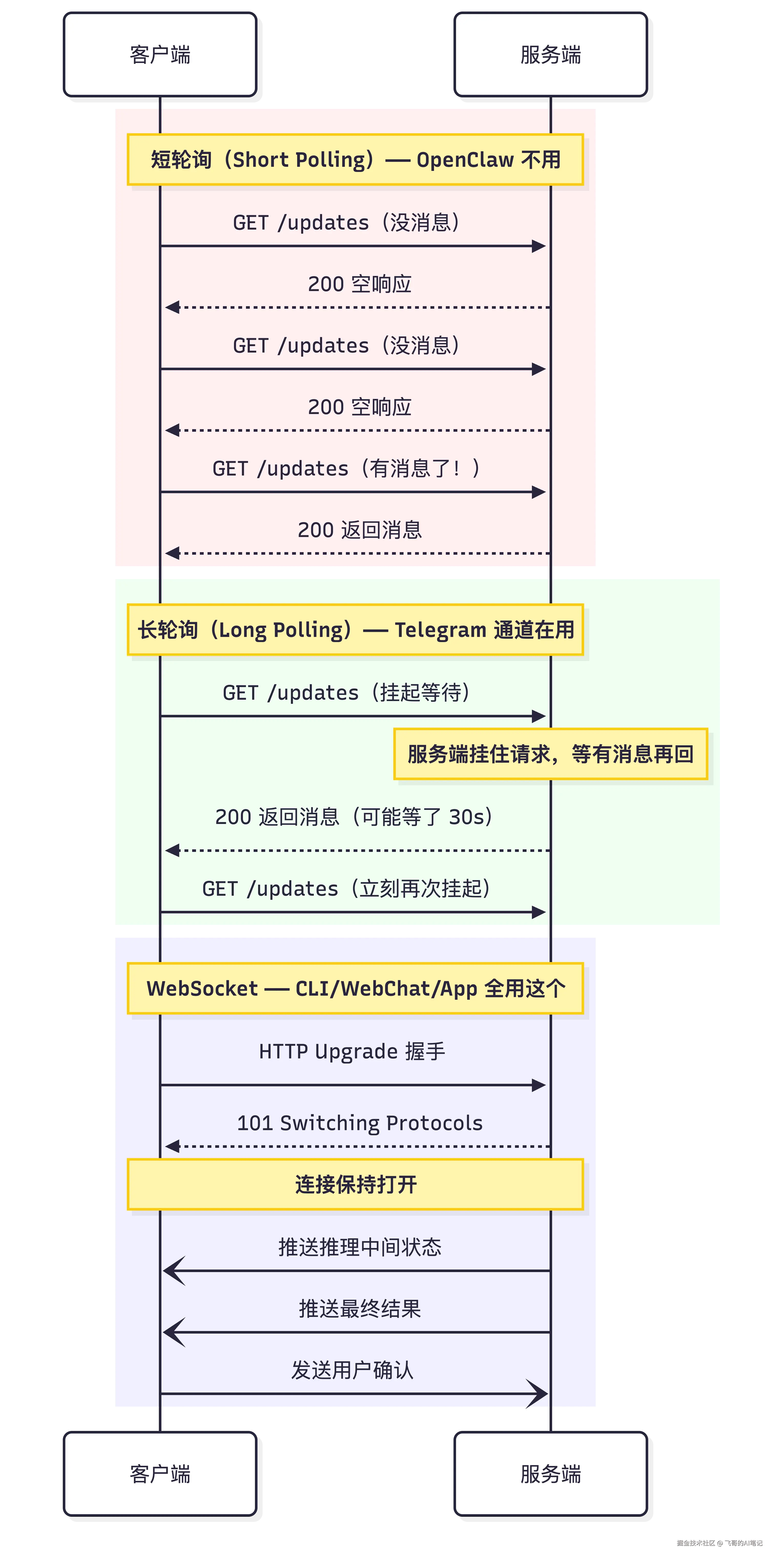 WebSocket 一次握手,连接永久保持。对 OpenClaw 来说,这意味着三件事同时成立:推理中间状态可以实时 stream 出来、用户确认可以随时插入流程、多个客户端能同步看到同一个 Agent 的状态变化。