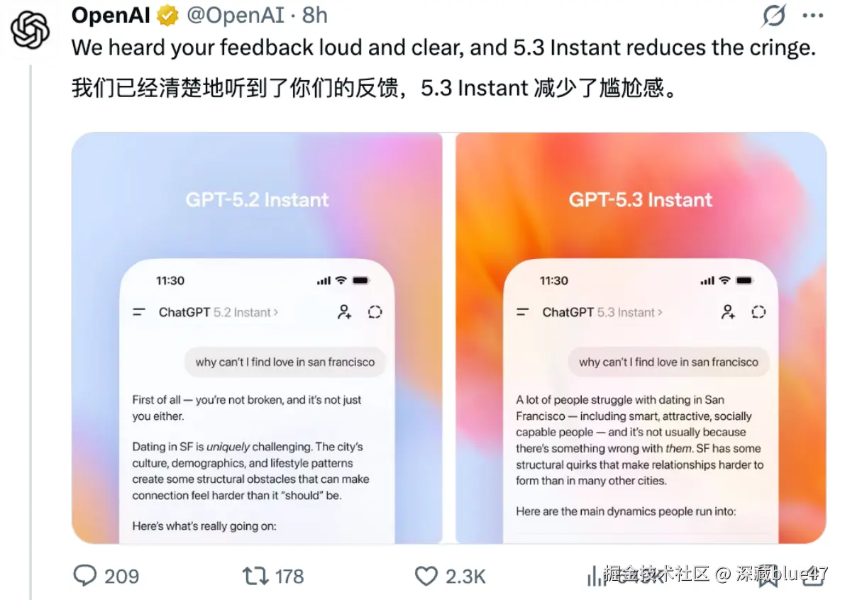 OpenAI 官方承认,GPT-5.2 Instant "爹味"太重(cringe)。GPT-5.3 Instant 彻底解决这些痛点: