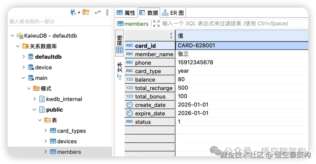 - 关系数据库相关的表:members、devices、card_types。