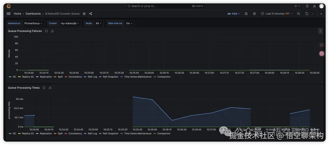队列:展示队列相关的监控指标,用到的 dashboard 文件为KaiwuDB_Console_Queue.json。