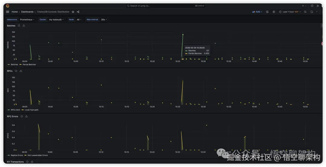 分布式:展示分布式相关的监控指标,用到的 dashboard 文件为KaiwuDB_Console_Distribution.json。