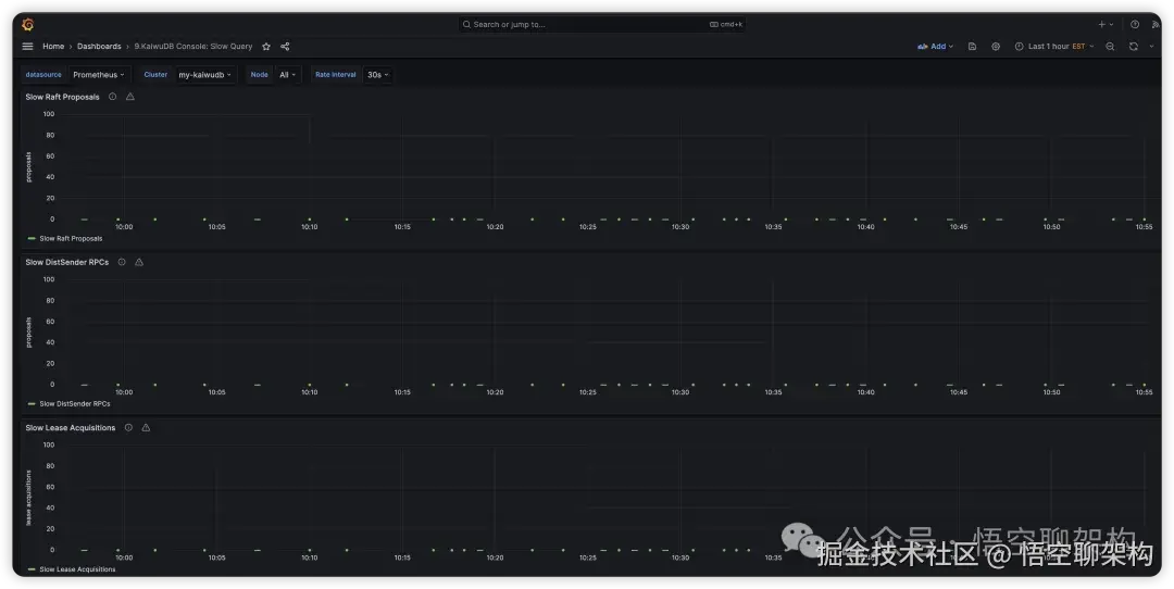 慢查询:展示慢查询相关的监控指标,用到的 dashboard 文件为KaiwuDB_Console_Slow_Query.json。