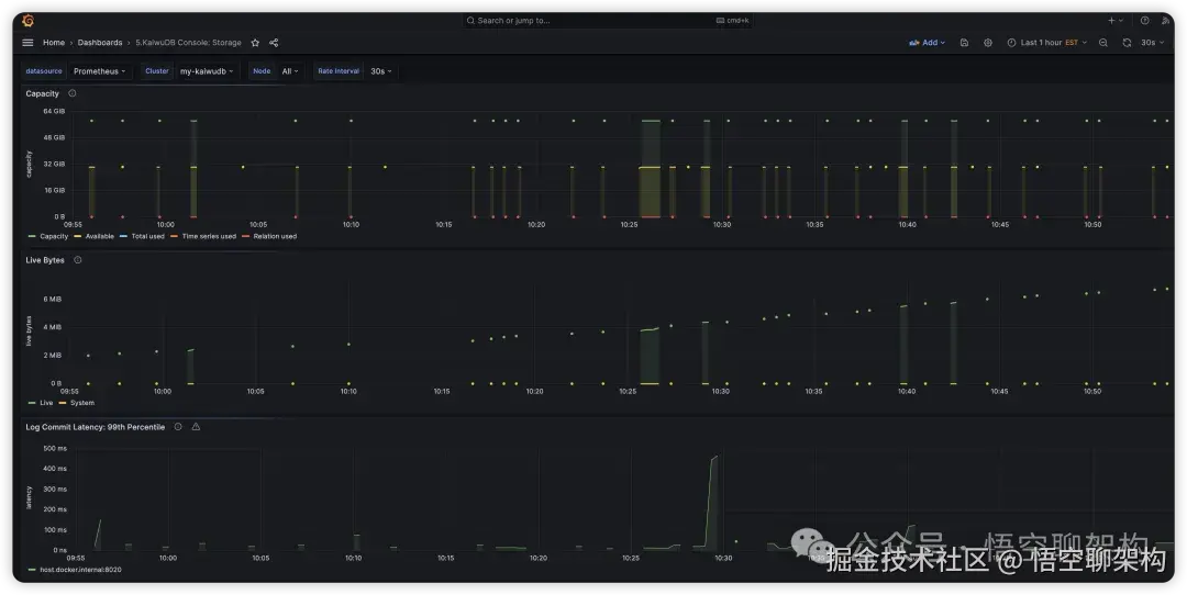 存储:展示存储相关的监控指标,用到的 dashboard 文件为KaiwuDB_Console_Storage.json。