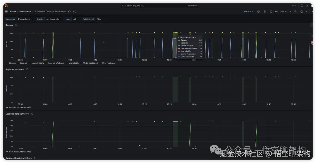 副本:展示副本相关的监控指标,用到的 dashboard 文件为KaiwuDB_Console_Replication.json。