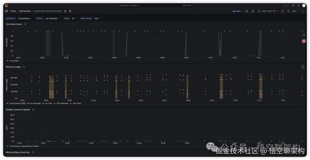运行时:展示运行时相关的监控指标,用到的 dashboard 文件为KaiwuDB_Console_Runtime.json。