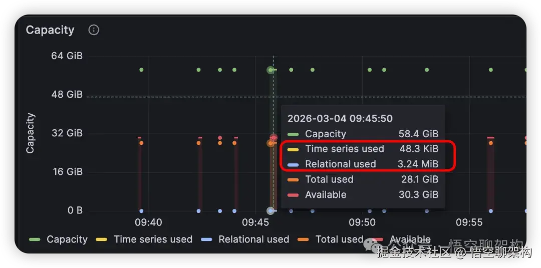 内存占用情况:关系库和时序库占用的内存都很小,3.24MB和48.3KB。