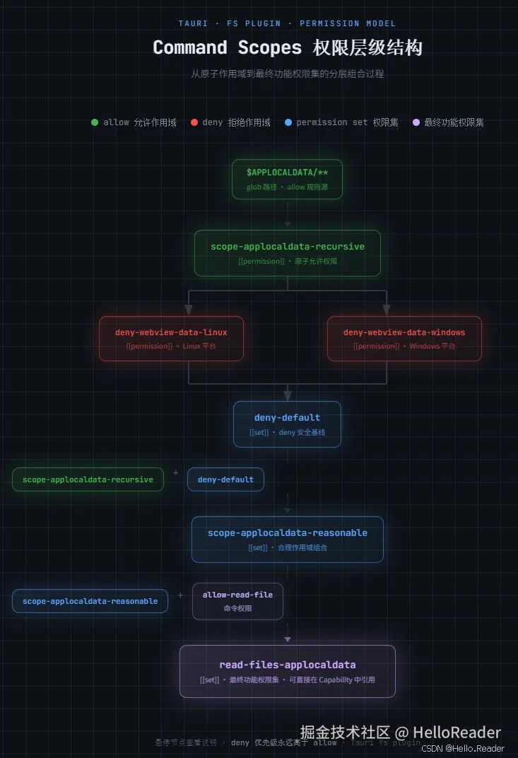 单个作用域权限如同零件,真正的工程实践是将它们有机组合。Tauri 推荐通过权限集(Permission Set) 进行分层组合,每一层都应有清晰的语义。
