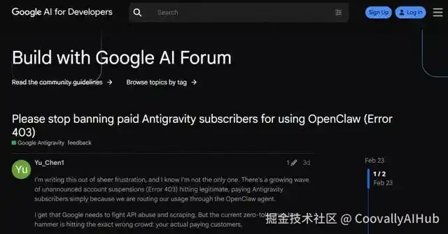 Google的"反薅羊毛"战: 谷歌工程师指控OpenClaw通过Antigravity后端进行"大规模恶意使用"。简单说,OpenClaw的自动化机制会定时、大量地消耗上下文Token,导致单个用户的API账单爆表,甚至影响普通用户的正常使用。谷歌因此封禁了大量通过OpenClaw使用其服务的付费用户。尽管Peter Steinberger公开表达不满,但舆论普遍认为,OpenClaw这种"技术性薅羊毛"的行为,确实触碰了商业模式的底线。