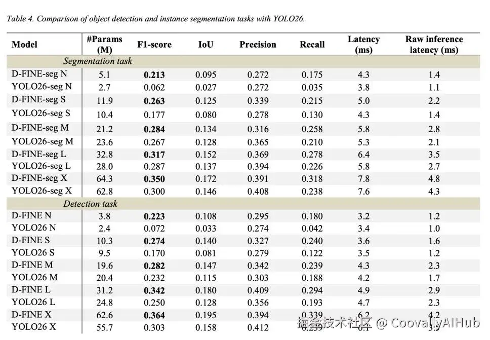 - 使用框架默认置信度阈值(YOLO26为0.25,D-FINE-seg为0.5)