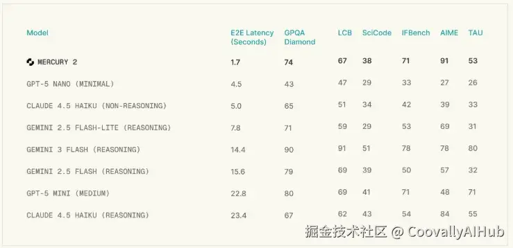 斯坦福、UCLA和康奈尔那几个学者攒了个局,叫Inception Labs 。他们搞出来的Mercury 2 ,路子有点野------把生成图像那套扩散模型的逻辑,硬搬到了语言模型里。结果呢?速度飙到每秒1000个token ,是Claude 4.5 Haiku的11倍,GPT-5 mini的14倍。更气人的是,它端到端跑一趟只要1.7秒,成本只有别人的六分之一,在AIME 2025数学基准上还能拿91.1分。