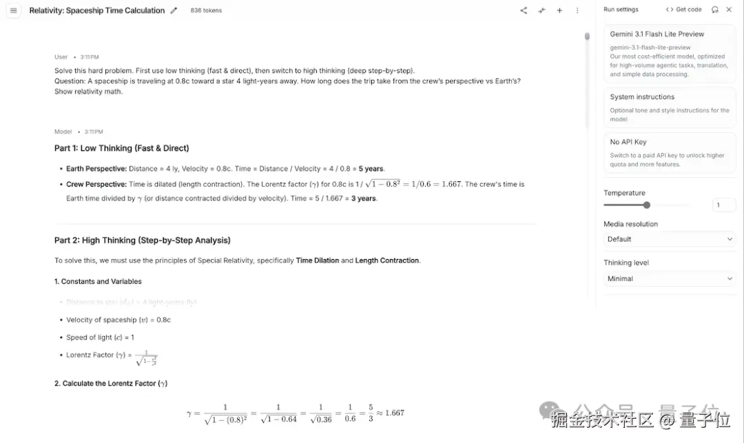 Gemini 3.1 Flash-Lite 正确使用了复杂物理学公式,回复结构也很完整,先给简要结论,再进行明确的数学推导。