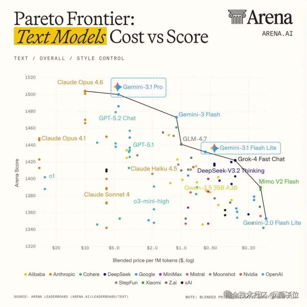 而 Gemini-3.1 Pro 则持续在高价位型号中保持第一梯队,Gemini 3 Flash 处于二者之间。