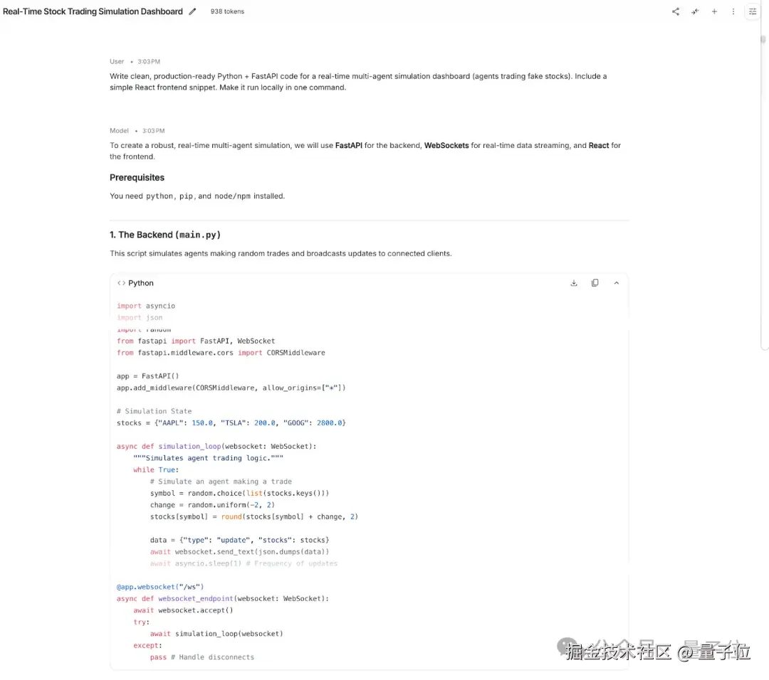 在编程测试中,Gemini 3.1 Flash-Lite 输出简洁直接,没有做复杂的项目拆分,以单文件实现了核心后端功能,可快速运行,无冗余内容。
