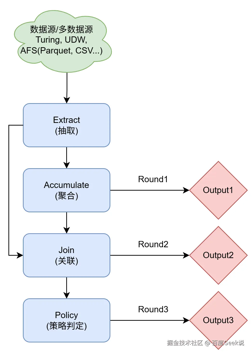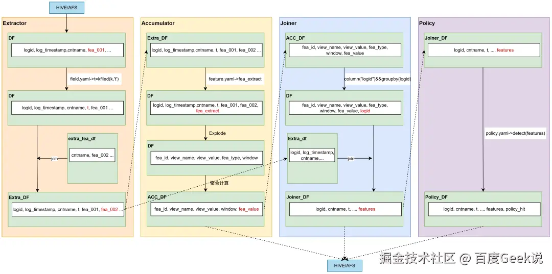 上图展示了离线挖掘框架的整体流程图,分为 extractor 模块、accmulator 模块、joiner 模块、policy 模块等。