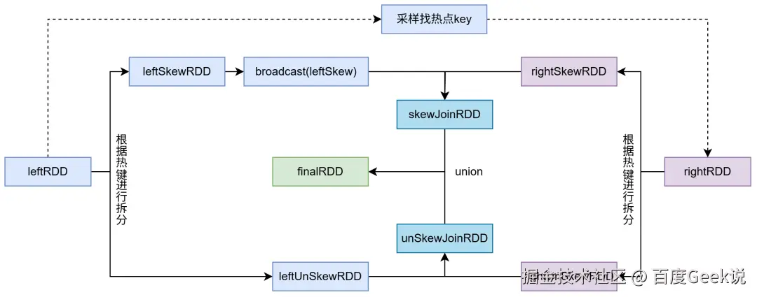 - 首先用 Spark API 的 sample() 统计左表 key 出现频次,先采样找出热点(大 Key)