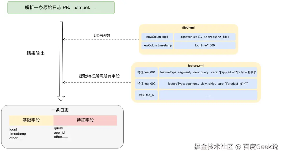 - 结果数据:从日志中解析抽取出所有特征中所需要的字段,以图中示例结果为:fea_id,log_timestamp,query,app_id,agent_id,baiduid,product_id,...,其中log_timestamp为必输出数据。