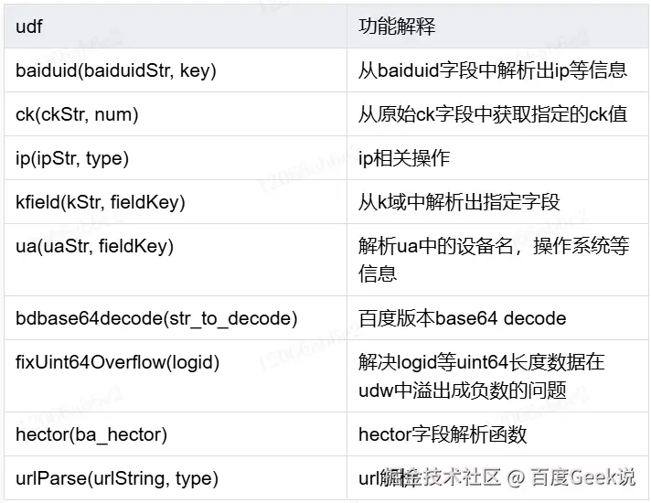 除了 spark sql 支持的所有原生 functions 之外,结合业务实际使用场景,还支持了 多个自定义数据处理算子,并支持用户自定义udf扩展。