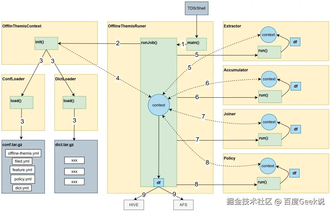 - 离线挖掘框架会加载配置信息, 运行spark 任务, 任务结束后将结果输出到 AFS。