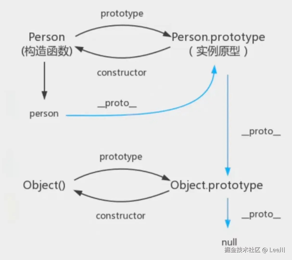 __proto__:每个实例都有一个__proto__属性,它在实例化时自动指向构造函数的prototype(图中蓝色曲线的含义)。 - 原型链查找机制 :访问属性时,JS 引擎会沿