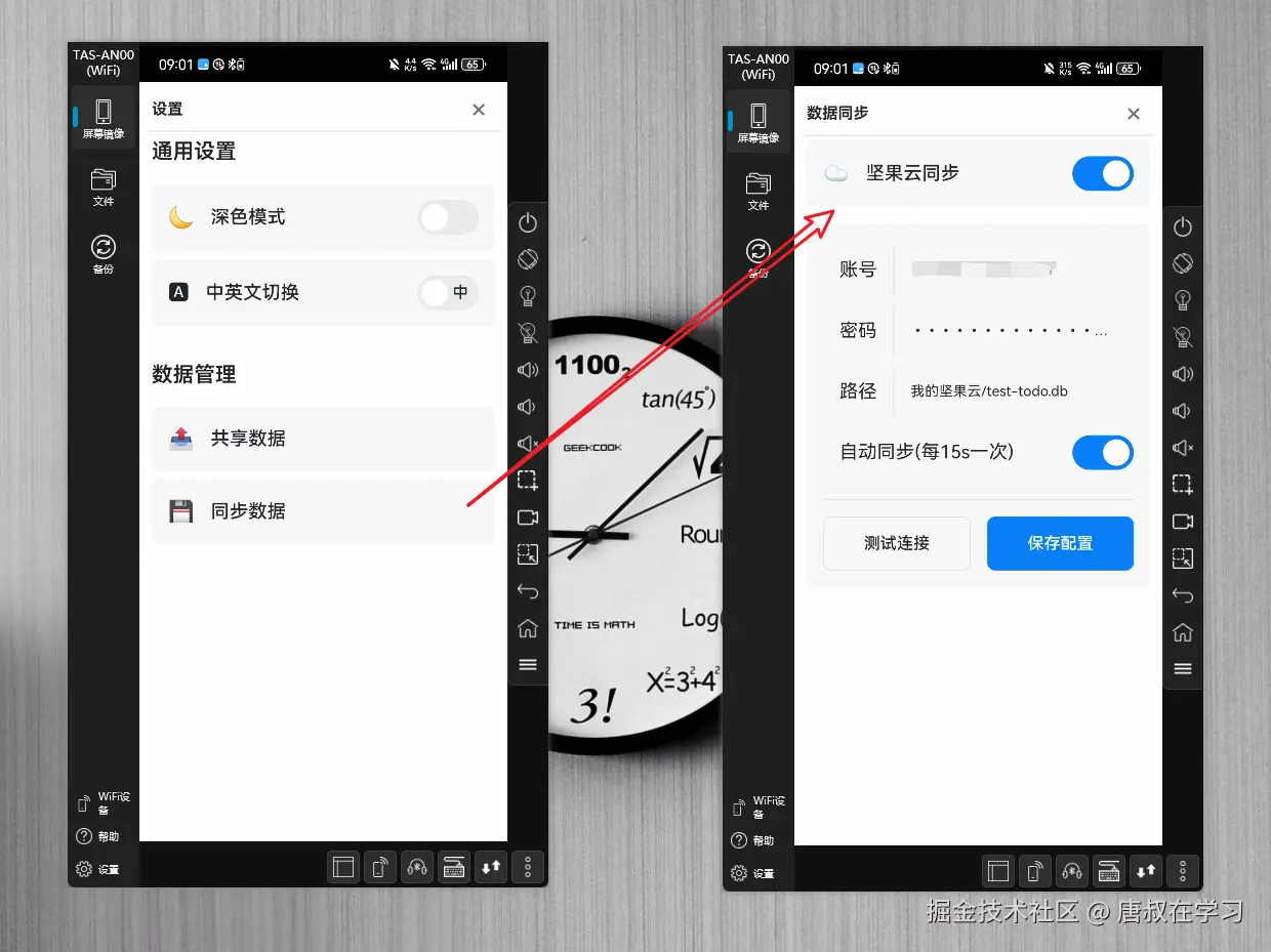 桌面端呢,由于坚果云的文件夹本身就具有数据同步,所以将存储的数据文件配置在文件夹上,就自动实现了桌面端的数据同步。