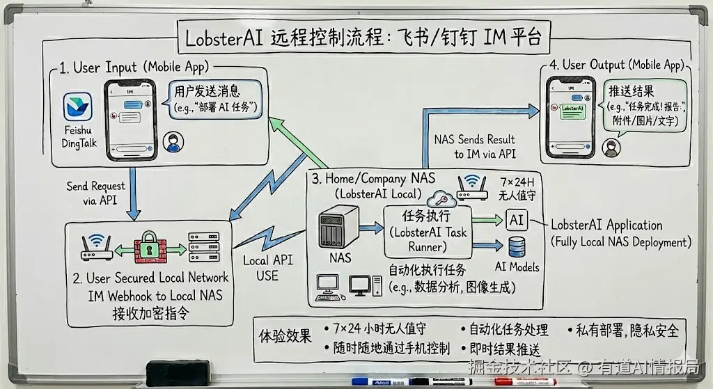 LobsterAI 支持通过飞书、钉钉 等 IM 平台进行远程控制。用户在手机上发一条消息,家里/公司部署了 LobsterAI 的 NAS 就会自动执行任务,执行完毕后将结果推送回 IM,实现 7×24 小时无人值守的 AI 助理体验。