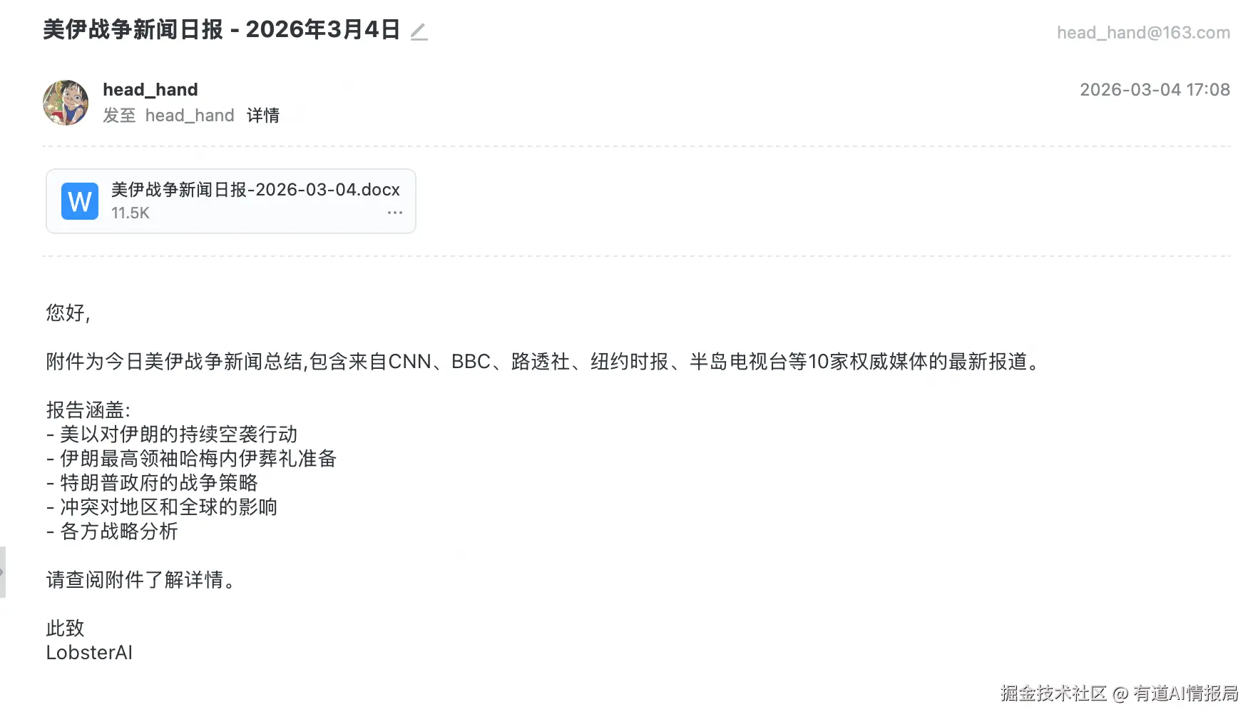 将整理结果生成排版美观的 Word 文档,包含:日期标题、10 篇文章的标题/来源/摘要/核心要点,以及整体局势简评。自动发送到指定邮箱。