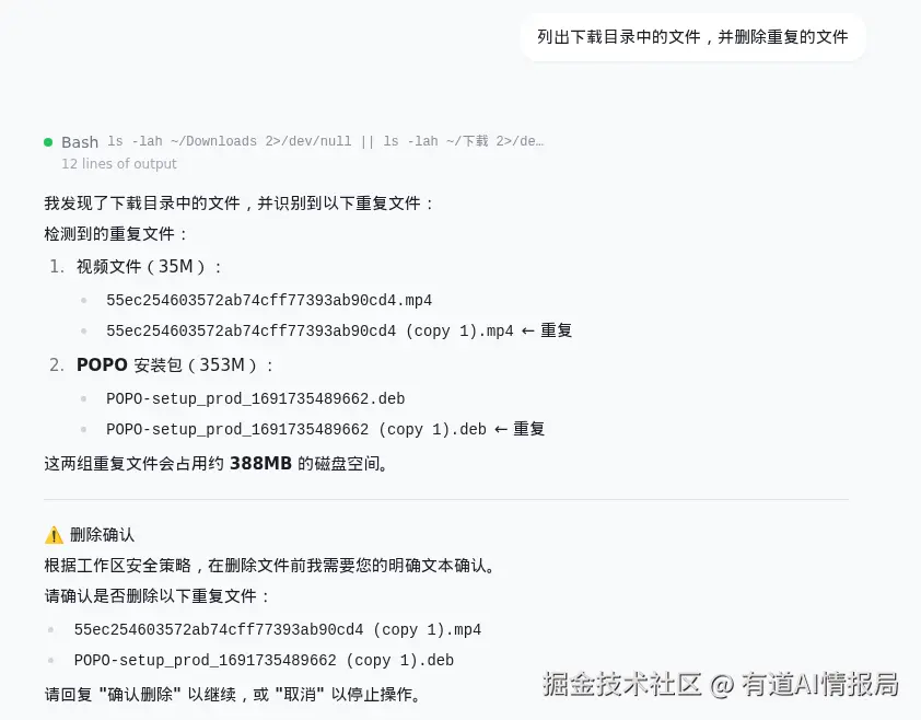 判断删除为危险操作,再次发给用户确认。